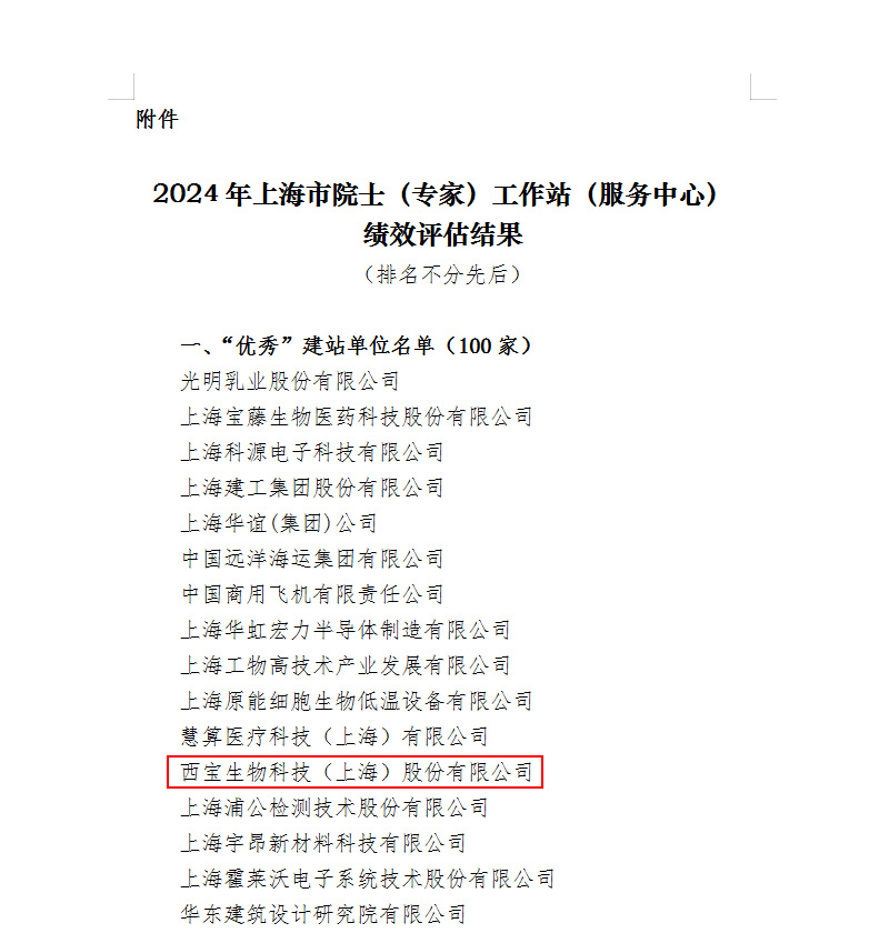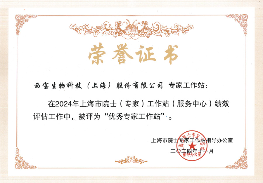 2024年11月,上海市院士專家工作站指導(dǎo)辦公室基于相關(guān)規(guī)定,對(duì)建站滿一年以上的院士(專家)工作站開(kāi)展相關(guān)評(píng)估工作。經(jīng)審評(píng),西寶生物科技(上海)股份有限公司院士專家工作站獲評(píng)“優(yōu)秀”建站單位,喜獲“優(yōu)秀專家工作站”榮譽(yù)。