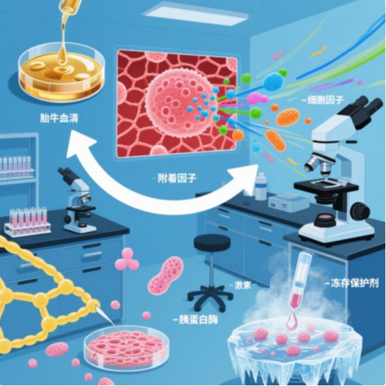 細胞培養(yǎng)技術作為現(xiàn)代生命科學研究的基礎工具,很大程度上取決于培養(yǎng)環(huán)境的精確控制。在標準培養(yǎng)基之外,各類補充劑和試劑的應用為細胞提供了必需的營養(yǎng)、生長信號和支持,確保細胞能夠在體外環(huán)境中維持其生理功能和增殖能力。本專題將深入探討細胞培養(yǎng)中常用的各類補充劑和試劑,包括血清、附著因子、細胞因子、激素、細胞解離試劑以及細胞冷凍試劑,全面解析它們的功能、應用及其在細胞培養(yǎng)中的重要性。