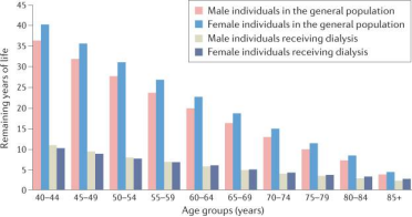 圖:2018年美國流行性腎衰竭人群和2017年普通人群的預(yù)期剩余壽命(單位:年)