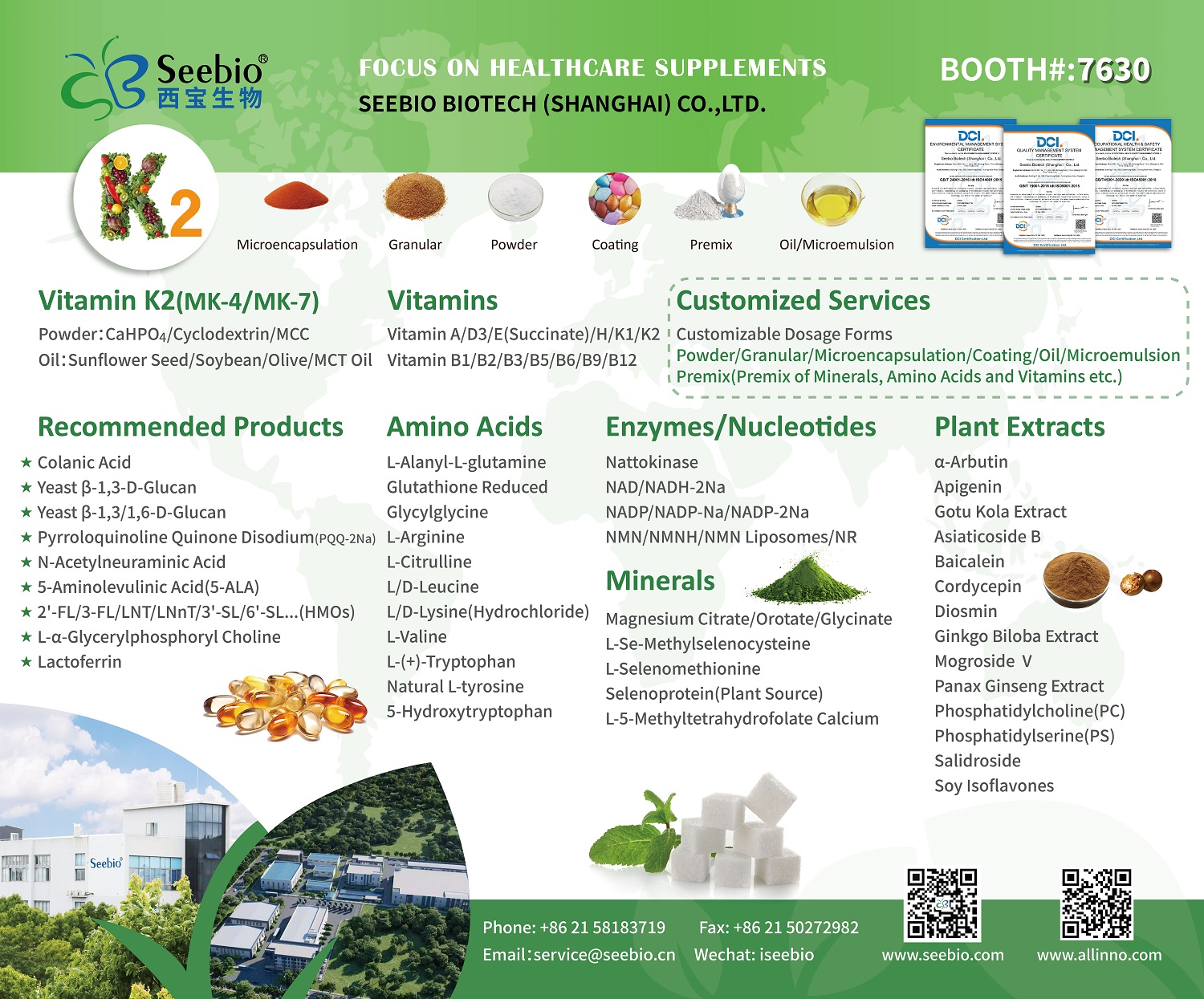 此外,西寶生物在展會(huì)上集中展示的多元明星產(chǎn)品矩陣,進(jìn)一步凸顯了我們“全品類(lèi)覆蓋”優(yōu)勢(shì):維生素系列涵蓋維生素K2(MK4、MK7)、維生素 E(succinate)/K1、維生素 B12等;功能性成分包含花生四烯酸、膠原蛋白 (Ⅰ 型至 Ⅳ 型)、乳鐵蛋白、甘油糖苷等;天然提取物涉及甜菊糖苷、羅漢果苷、紅景天苷、牛至提取物、白柳樹(shù)皮提取物等;還包括硫酸葡聚糖(DSS)、人乳寡糖(HMOs)、尿石素 A/B、有機(jī)硒(L-硒-甲基硒代半胱氨酸等)、角鯊烯/角鯊?fù)榈燃?xì)分領(lǐng)域核心原料。豐富的產(chǎn)品品類(lèi)與過(guò)硬的技術(shù)品質(zhì),吸引了眾多國(guó)際采購(gòu)商、研發(fā)機(jī)構(gòu)駐足交流,現(xiàn)場(chǎng)達(dá)成多項(xiàng)合作意向。