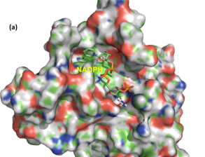 圖:Stereoviewof the overall model structure of enzyme-cofactor docking with NADPH (a) and NADH (b), respectively, illustrated by the PyMOL program.