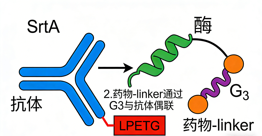 分選酶A可以識別LPXTG氨基酸序列,將T-G間肽鍵斷裂形成LPXT-SrtA,含親核oligo-G的分子進(jìn)入重構(gòu)形成新的肽鍵,相較于傳統(tǒng)化學(xué)偶聯(lián)的ADC藥物,藥物抗體比率(DAR)通常為0-8,導(dǎo)致療效不穩(wěn)定、毒副作用強(qiáng)。分選酶介導(dǎo)的連接更加精準(zhǔn)快捷,使DAR值固定為2或4,從源頭解決異質(zhì)性問題。