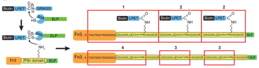 ②生物素標記與高靈敏度檢測:有研究首次證實分選酶A的非典型異肽連接活性可用于重組蛋白修飾。實驗中,研究者用生物素修飾的LPETG肽作為底物,在分選酶A催化下,將生物素特異性偶聯到Fn3-PLN3-ELP融合蛋白的菌毛結構域賴氨酸上,之后通過鏈霉親和素-Cy5進行免疫印跡檢測,結合SDS-PAGE和基質輔助激光解吸電離飛行時間質譜驗證,只有含菌毛結構域和生物素修飾LPETG肽的反應體系才會出現目標蛋白的生物素化條帶。該方式實現了生物素對蛋白特定位點的精準標記,借助鏈霉親和素系統(tǒng)達成了目標蛋白的高靈敏度鑒定?!?】