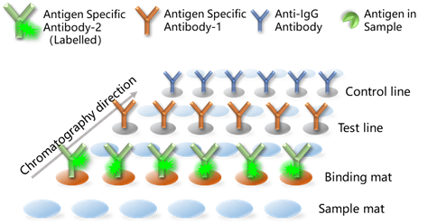 抗原快速檢測試紙條示意圖 | 抗原檢測法反應(yīng)原理示意圖 |