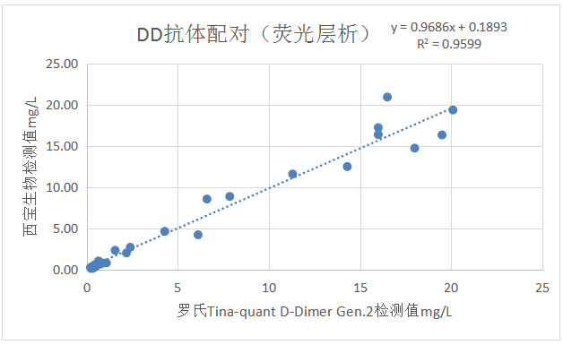 與羅氏Tina-quant D-Dimer Gen.2試劑檢測(cè)的臨床相關(guān)性R2>0.95。