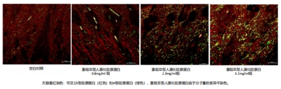 文獻表明* :重組III型人源化膠原蛋白與細胞外基質(ECM)進行整合后8周,可觀察到其顯著促進組織的I型、III型膠原蛋白的再生,加入的濃度不同,再生作用也表現(xiàn)出差異: