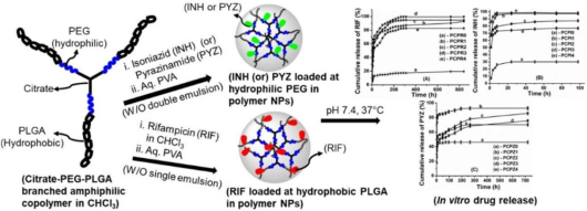 再者利福平 (RIF)、異煙肼 (INH)和吡嗪酰胺(PYZ),基于PLGA- PEG的兩親性支化共聚物納米粒子(NPs) 已開(kāi)發(fā)用于結(jié)核病 (TB) 藥物的控釋。支化 PLGA-PEG 的共聚物 NP 表現(xiàn)出初始爆發(fā)釋放,隨后持續(xù)釋放 RIF 840 小時(shí)、INH 72 小時(shí)和 PYZ 720 小時(shí)。與線性類似物相比,良好的數(shù)據(jù)讓支化檸檬酸酯-PEG-PLGA 共聚物納米顆??勺鳛闈撛诘乃幬镙d體[10]。