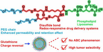 PEG修飾生物分子一般有主要的連接鍵有酰胺鍵、醚鍵、酯鍵和二硫鍵等等,不同的連接鍵性質(zhì)也會(huì)對(duì)PEG-Lipid在體內(nèi)的穩(wěn)定性,靶標(biāo)內(nèi)濃度和釋放速度產(chǎn)生相應(yīng)的影響。例如研究人員針對(duì)腫瘤細(xì)胞的酸性環(huán)境,開(kāi)發(fā)酸性環(huán)境中可裂解PEG-Lipid的連接鍵(半縮醛,pH敏感的苯甲酸酯等),或在PEG主鏈上插入酸性敏感的化學(xué)修飾(如-S-S-,硼酸酯等等)來(lái)增加載藥脂質(zhì)體在目標(biāo)靶標(biāo)中釋放藥物[12]- [14]。