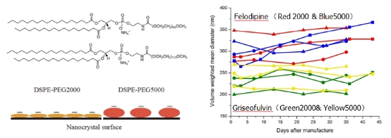 >DSPE-PEG2K/5K納米脂質(zhì)體表面比列示意及其穩(wěn)定的非洛地平和灰黃霉素的體積加權(quán)平均直徑[16]