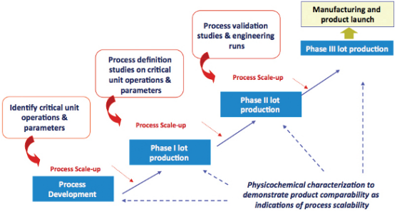 疫苗產(chǎn)品多樣且復(fù)雜,包括滅活或解毒疫苗;重組蛋白疫苗;腺病毒疫苗;及治療性疫苗等,圖1描述了原料藥疫苗工藝開發(fā)的通用方法。工藝開發(fā)從實(shí)驗(yàn)室規(guī)模開始,用于確定單元操作和參數(shù),然后逐步擴(kuò)大規(guī)模(通常在20L發(fā)酵或細(xì)胞培養(yǎng)下),用于生產(chǎn)用于I期臨床研究的GMP材料。在擴(kuò)展到200 L(通常用于第二階段)之前,使用實(shí)驗(yàn)設(shè)計(jì)(DoE)對(duì)關(guān)鍵單元操作和參數(shù)進(jìn)行過(guò)程定義研究。在第三階段(約2000L規(guī)模)之前,需要進(jìn)行工藝驗(yàn)證和工程運(yùn)行。在工藝開發(fā)和放大過(guò)程中,進(jìn)行生物物理和化學(xué)表征,以證明產(chǎn)品的可比性和工藝可擴(kuò)展性。