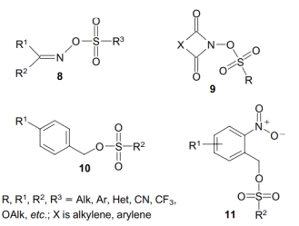 這類化合物中重要的是磺酸酯,它在光照下會產(chǎn)生強酸。他們包括亞氨基磺酸鹽 (化合物8), 酰亞胺磺(化合物9) 和芐基磺酸鹽(化合物10) 。在苯磺酸鹽中,只有對硝基和鄰硝基苯基磺酸酯(化合物11)在光照下產(chǎn)生酸[7],這些異構體通過不同的機制產(chǎn)生光酸。非離子型PAG在有機溶劑和聚合物薄膜中具有較高的溶解度,但與鎓鹽相比,它們的熱穩(wěn)定性較差(可以通過進一步的化學修飾進行改進)。