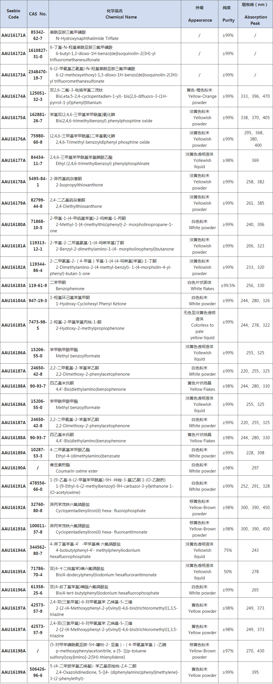 Seebio現(xiàn)貨供應光引發(fā)劑(PI)/光敏劑(PAC)/光致產(chǎn)酸劑(PAG)產(chǎn)品