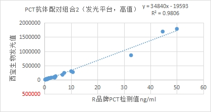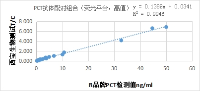 與R品牌PCT試劑臨床相關性R2>0.97,低值部分(≤4ng/ml)與R品牌PCT試劑相關性R2>0.96。