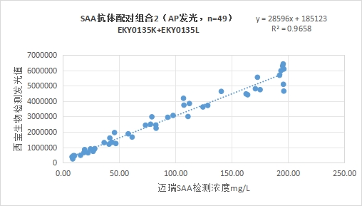 組合1:血清淀粉樣蛋白A(SAA)抗體(貨號:EKY0135K)包被羧基磁珠+血清淀粉樣蛋白A(SAA)抗體(貨號:EKY0135L)標(biāo)記吖啶酯;