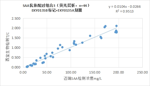 西寶生物熒光平臺SAA抗體配對組合3與邁瑞醫(yī)療SAA試劑(免疫比濁法)試劑賦值的臨床樣本相關(guān)性R2在0.95左右,相關(guān)性良好。