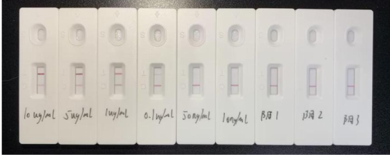 2.1.4 實(shí)驗(yàn)結(jié)果:在膠體金免疫層析平臺(tái),采用此抗體配對(duì)組合測試腺病毒(ADV)抗原稀釋梯度均顯色,測試三例陰性樣品均不顯色,靈敏度可達(dá)10ng/mL,表明此抗體配對(duì)在膠體金層析平臺(tái)測試性能良好。