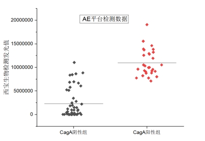 圖1為AE平臺檢測臨床樣本發(fā)光值分布,CagA陰性組發(fā)光值均值與CagA陽性組發(fā)光值均值能夠明顯區(qū)分。由表1數(shù)據(jù)可得,3例假陽性樣本及5例假陰樣本均落在參考系統(tǒng)的cutoff附近,屬于灰區(qū),需要用第三方試劑進(jìn)行確認(rèn)。西寶生物AE組合與參考系統(tǒng)的靈敏度大于80%,特異性及符合率大于90%,說明兩種試劑的臨床符合率較高。