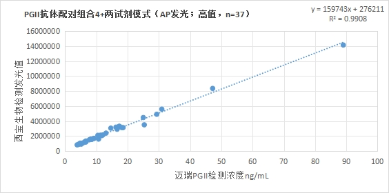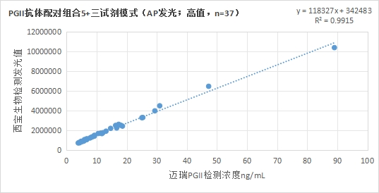 西寶生物發(fā)光(AP)平臺PGII抗體配對組合4(兩試劑模式)與邁瑞醫(yī)療PGII試劑(化學(xué)發(fā)光法)賦值的臨床樣本相關(guān)性R2>0.95,相關(guān)性良好;