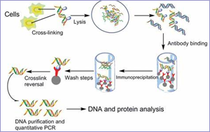 染色質(zhì)免疫沉淀技術(shù)(ChIP,Chromatin Immunoprecipitation Assay)通過與染色質(zhì)片段共沉淀和qPCR技術(shù),在體內(nèi)檢測與特異蛋白質(zhì)結(jié)合的DNA片段。ChIP技術(shù)較大的優(yōu)點(diǎn)就是在活體細(xì)胞狀態(tài)下研究了蛋白質(zhì)和目的基因結(jié)合狀況,減少了體外實(shí)驗(yàn)的誤差。