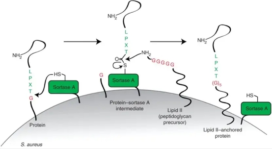 圖:Schematic representation of how proteins are anchored to the cell wall via sortase in Gram-positive bacteria. [1]