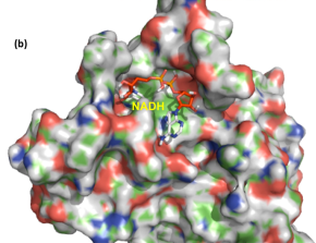 圖:Stereoviewof the overall model structure of enzyme-cofactor docking with NADPH (a) and NADH (b), respectively, illustrated by the PyMOL program.