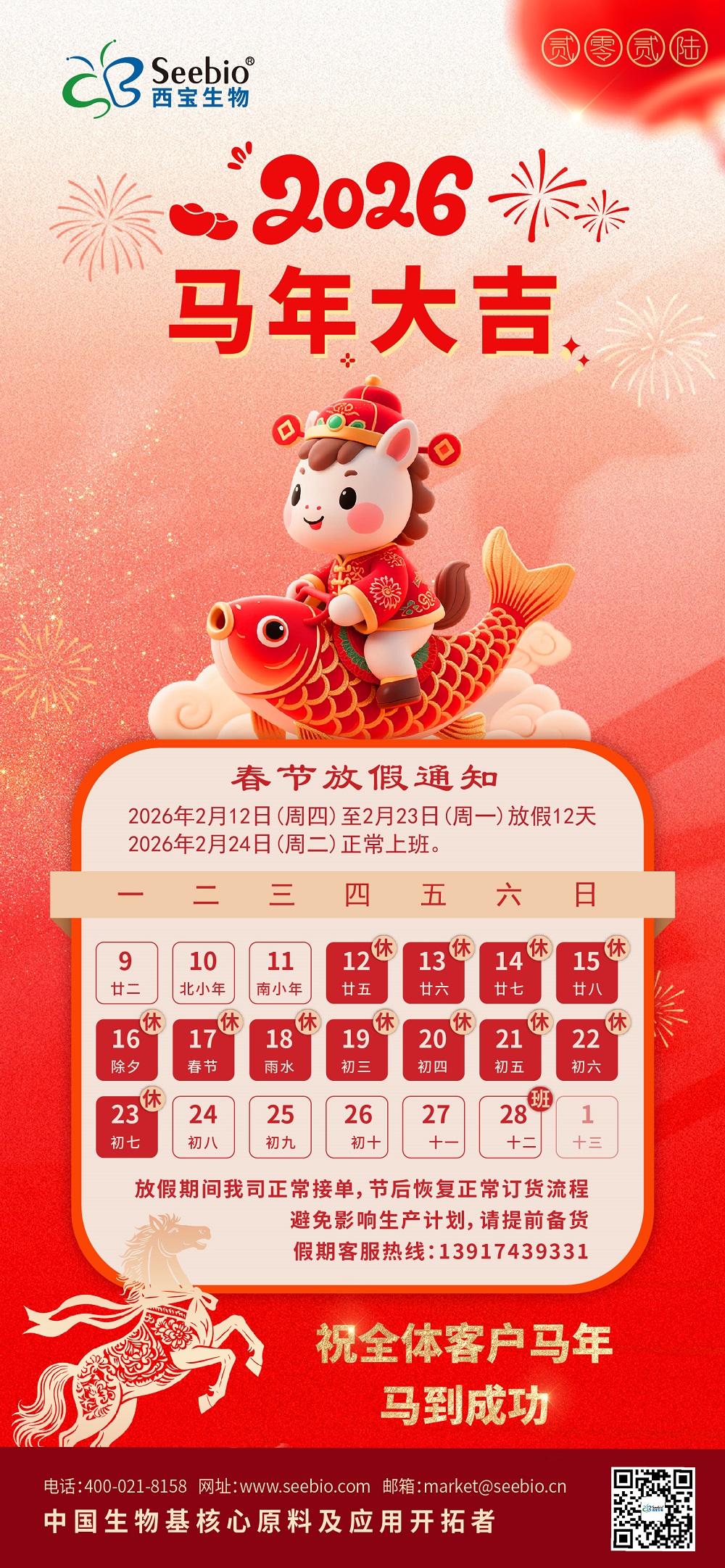 新春啟序,歲律更新。回望過往一年,西寶生物的每一步成長,都離不開全體員工的凝心聚力與辛勤付出--是大家的堅(jiān)守與拼搏,鑄就了公司發(fā)展的堅(jiān)實(shí)根基;更離不開各位客戶及合作伙伴的信任與鼎力支持--是你們的認(rèn)可與陪伴,賦予我們前行的無限動力。展望新的一年,西寶生物將懷揣感恩之心,攜手全體員工深耕細(xì)作,秉持匠心精進(jìn)服務(wù),與各位客戶伙伴繼續(xù)并肩同行、共赴新程。衷心祝愿全體員工及各位客戶伙伴度過一個(gè)幸福祥和的春節(jié),在假期中養(yǎng)精蓄銳、舒展身心,新歲啟封,萬事順?biāo)欤笳购陥D!