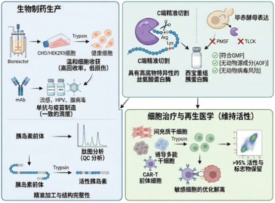 胰蛋白酶憑借 “精準(zhǔn)酶切”與 “溫和操控” 的雙重特性,能夠完美適配不同應(yīng)用場景的嚴(yán)苛需求。
