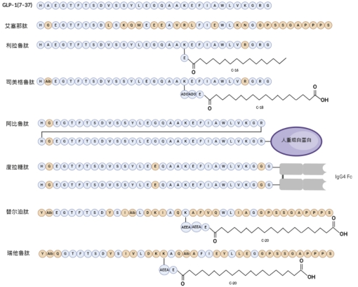 阿比魯肽和度拉糖肽均為融合蛋白,分別于2014年在美國上市。阿比魯肽由GLP-1類似物與重組人白蛋白相連,度拉糖肽則由GLP-1類似物與IgG4 Fc片段相連,均延長了半衰期。