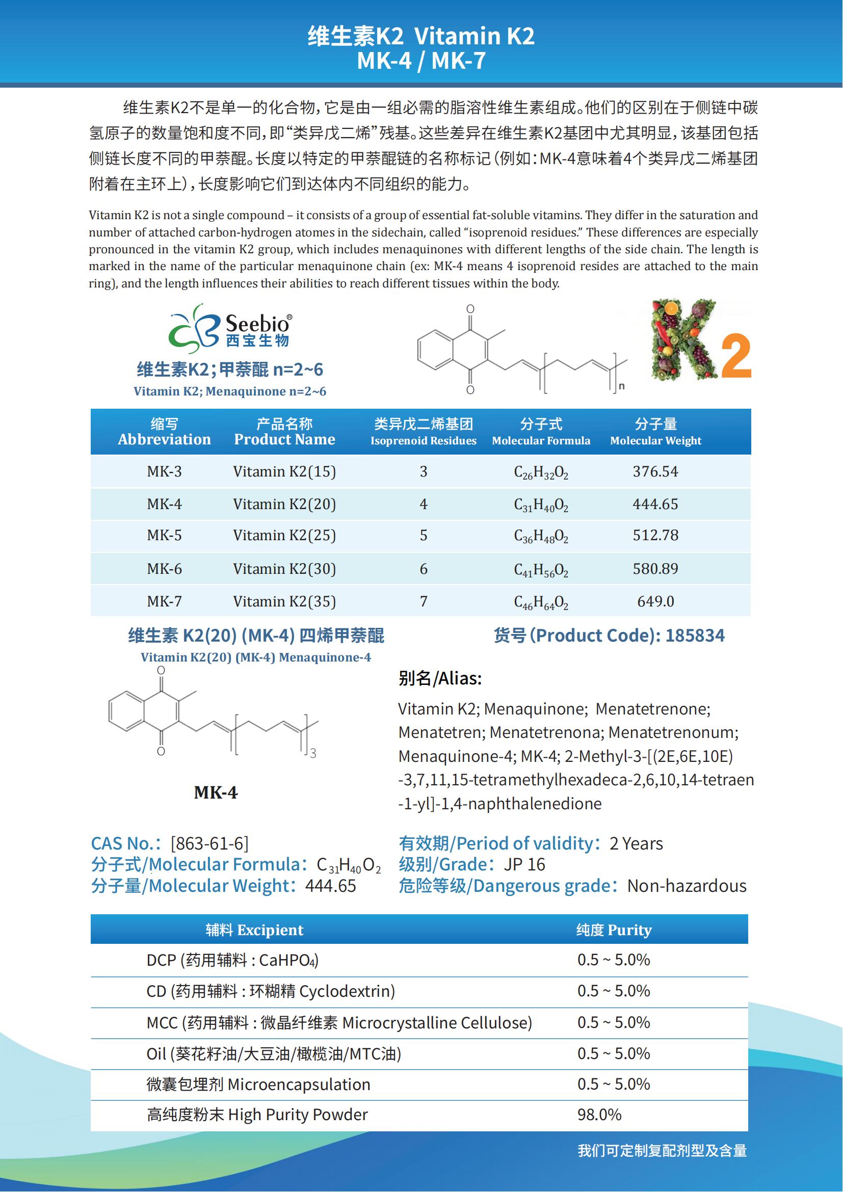 維生素K2不是單一的化合物,它是由一組必需的脂溶性維生素組成。他們的區(qū)別在于側(cè)鏈中碳?xì)湓拥臄?shù)量飽和度不同,即“類異戊二烯”殘基。這些差異在維生素K2基團(tuán)中尤其明顯,該基團(tuán)包括側(cè)鏈長度不同的甲萘醌。長度以特定的甲萘醌鏈的名稱標(biāo)記(例如:MK-4意味著4個類異戊二烯基團(tuán)附著在主環(huán)上),長度影響它們到達(dá)體內(nèi)不同組織的能力。
